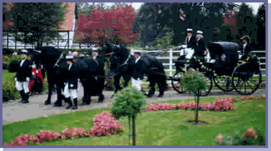 Unsere Karossiers, vor einer historischen Kutsche aus dem 18. Jahrhundert in stilvoller Stadtanspannung mit Kumtgeschirren und Buxtonkandaren korrekt und sicher gefahren von unserer FN-geprüften Fahrlehrerin begleitet von ihren Grooms vom Fahrstall Königsbusch.